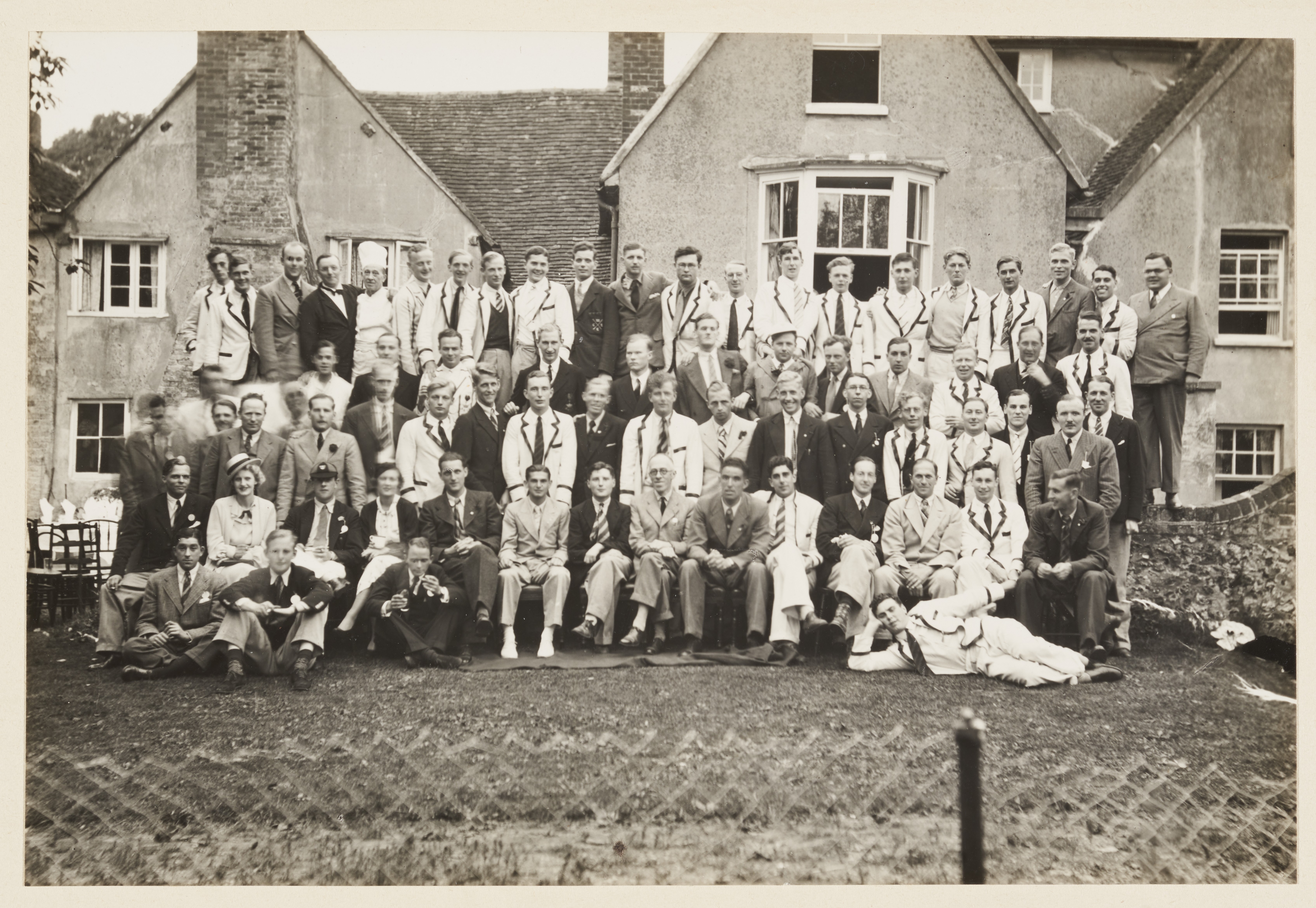 A group photograph of Boat Club members posing on the front lawn of a house. Includes a man in a chef's uniform and one woman.
