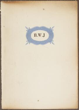 The front cover of a post card with the initials B. W. J, belonging to Bernard Jaffe. The edges of the card contain fire damage.