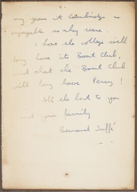The inside page of a postcard from Bernard Jaffe to Percy praising him on his work with the Jesus College Boat Club. Signed by Bernard Jaffe. The page has fire damage on the edges.