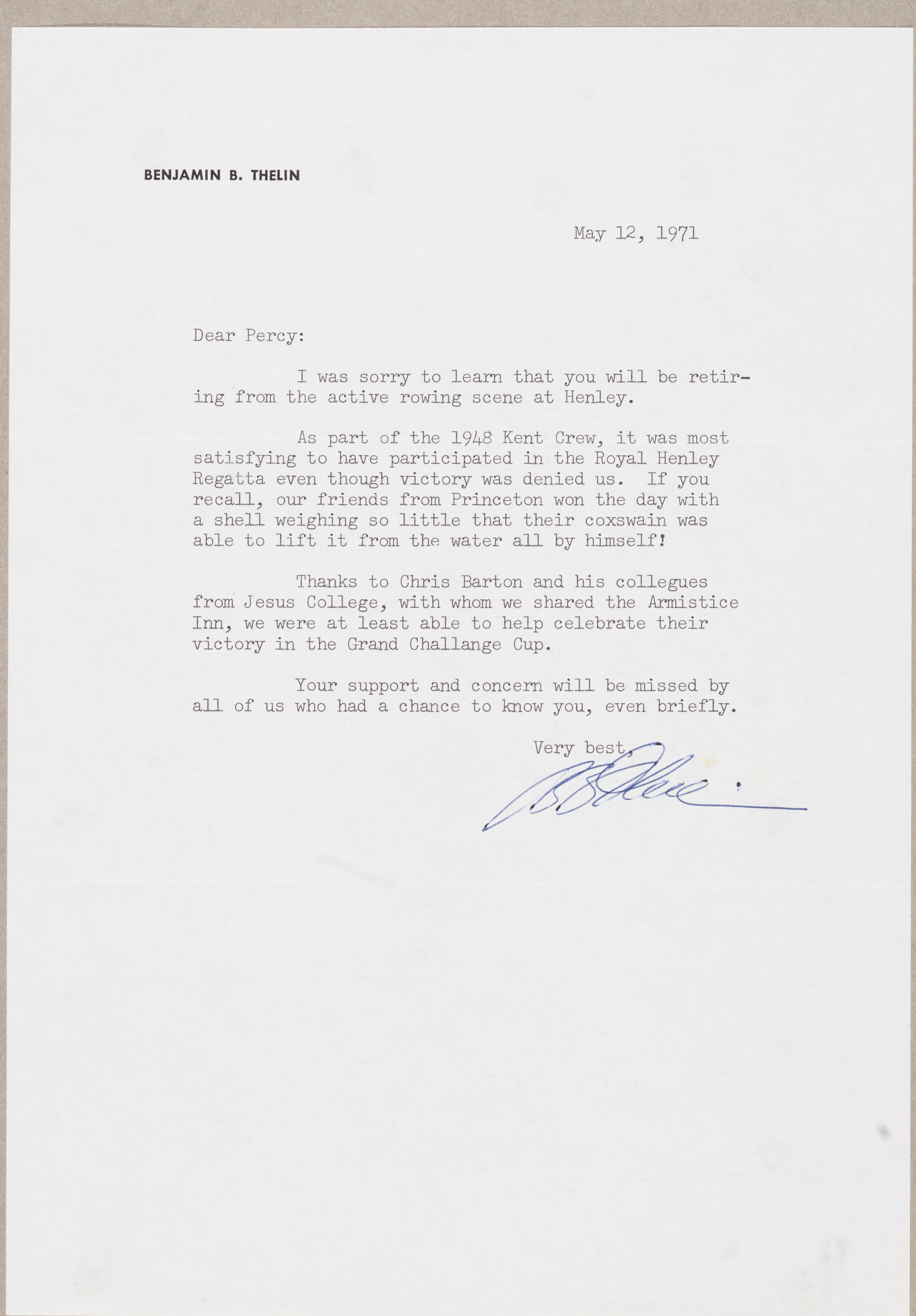 A letter from Benjamin B. Thelin, a former member of the 1948 crew, to Percy, expressing how sorry he is to hear of his retirement. He reminisces about Princeton winning at the Royal Henley Regatta and how their coxwain was able to lift their shell by himself. He also remembers celebrating at the Armistice Inn with Chris Barton and his Jesus College colleagues when winning in the Grand Challenge Cup. He closes the letter expressing how much his support and concern will be missed.