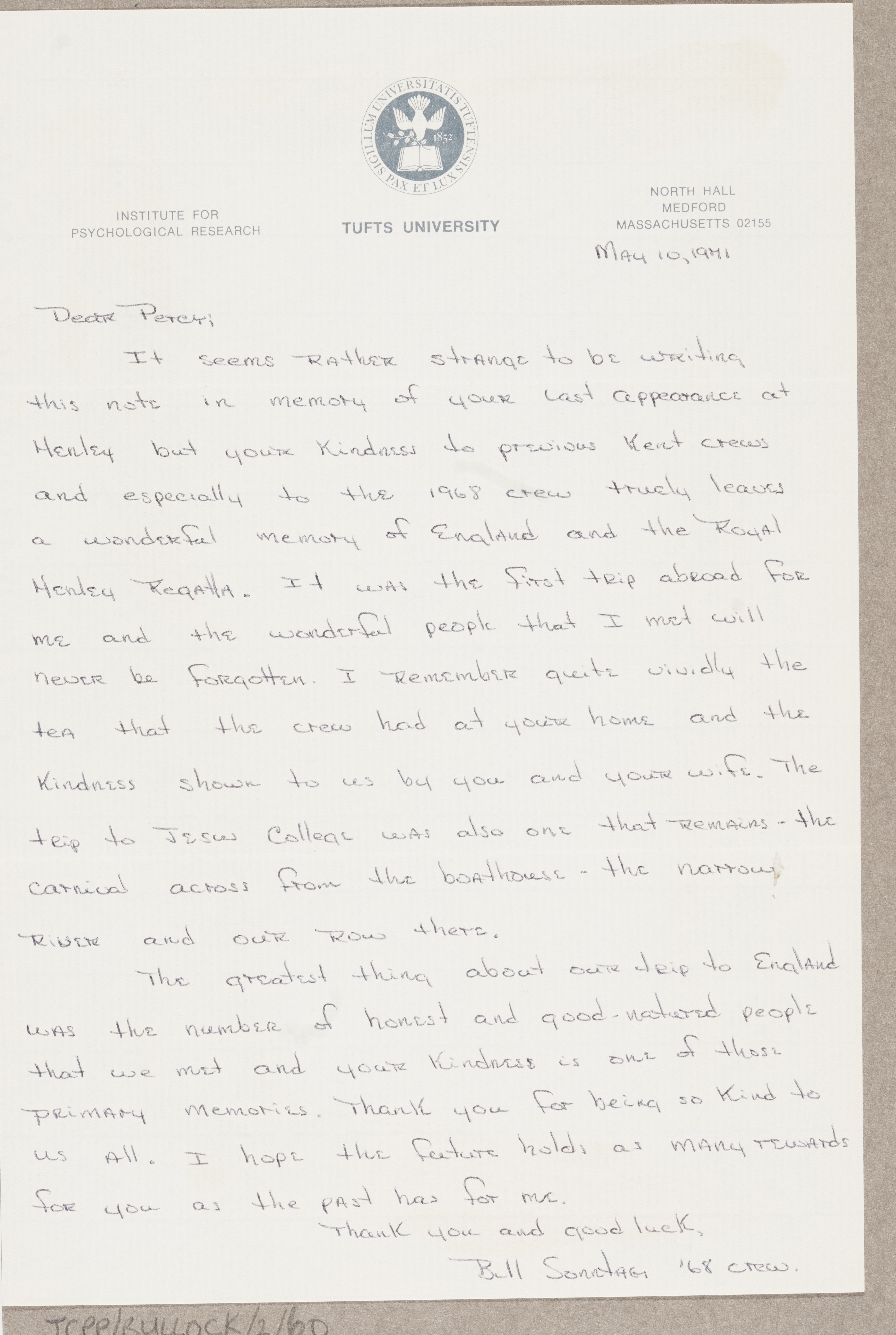 A letter from Bill Sonntag, on Tufts University letter head paper, to Percy. He reminisces on his memories of Percy at Henley and attributes his happy experience with Percy's kindness. He recalls being invited to Percy's home for tea, the tour of Jesus college, and rowing on the Cam. He closes the letter by offering his thanks and wishing him the best for the future. signed, Bill Sonntag '68 Crew.
