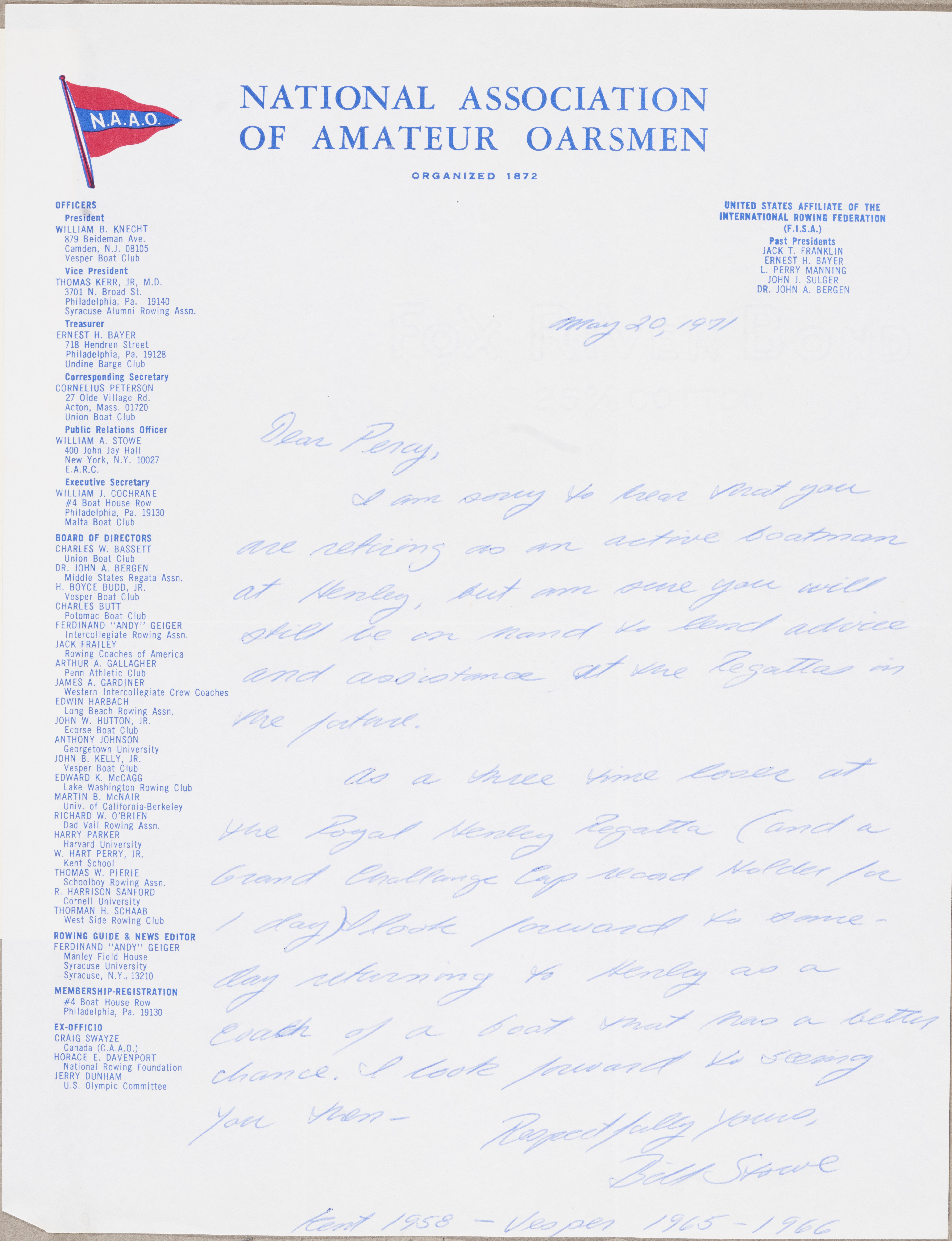 A letter from Bill Stowe on letterhead paper titled ' NATIONAL ASSOCIATION OF AMATEUR OARSMEN' to Percy, expressing his sadness at hearing of his retirement as an active boatman at Henley. He tells him that as three time loser at the Royal Henley Regatta, he is looking forward to returning some day as a coach of team that stands a better chance. Signed, Respectfully Yours, Bill Stowe, Kent 1958 - Vespers 1965-1966