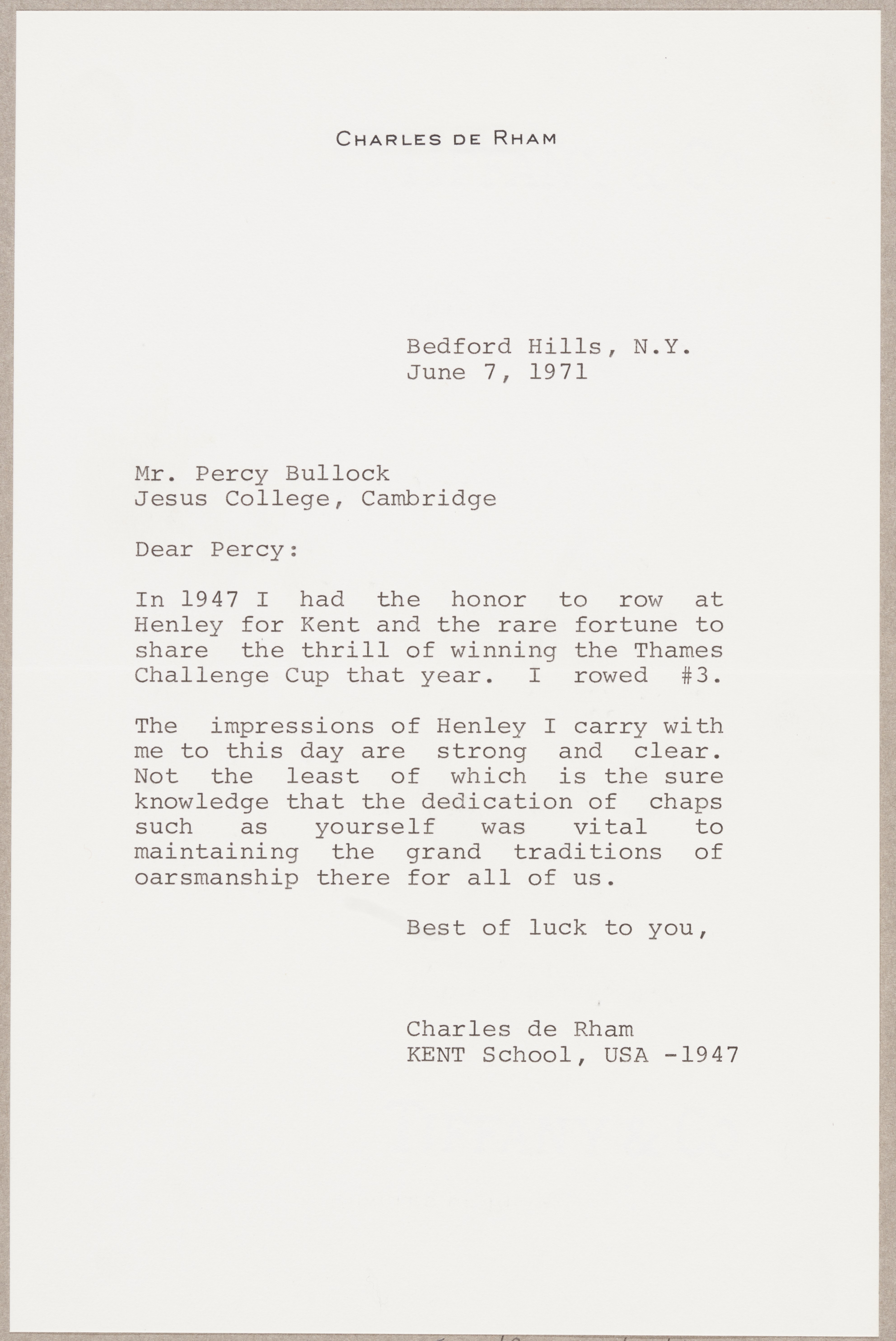 A letter from Charles de Rham in New York to Percy, wishing him the best of luck and reminiscing of his time at Henley, and his memories of rowing in The Thames Challenge Cup in 1947.