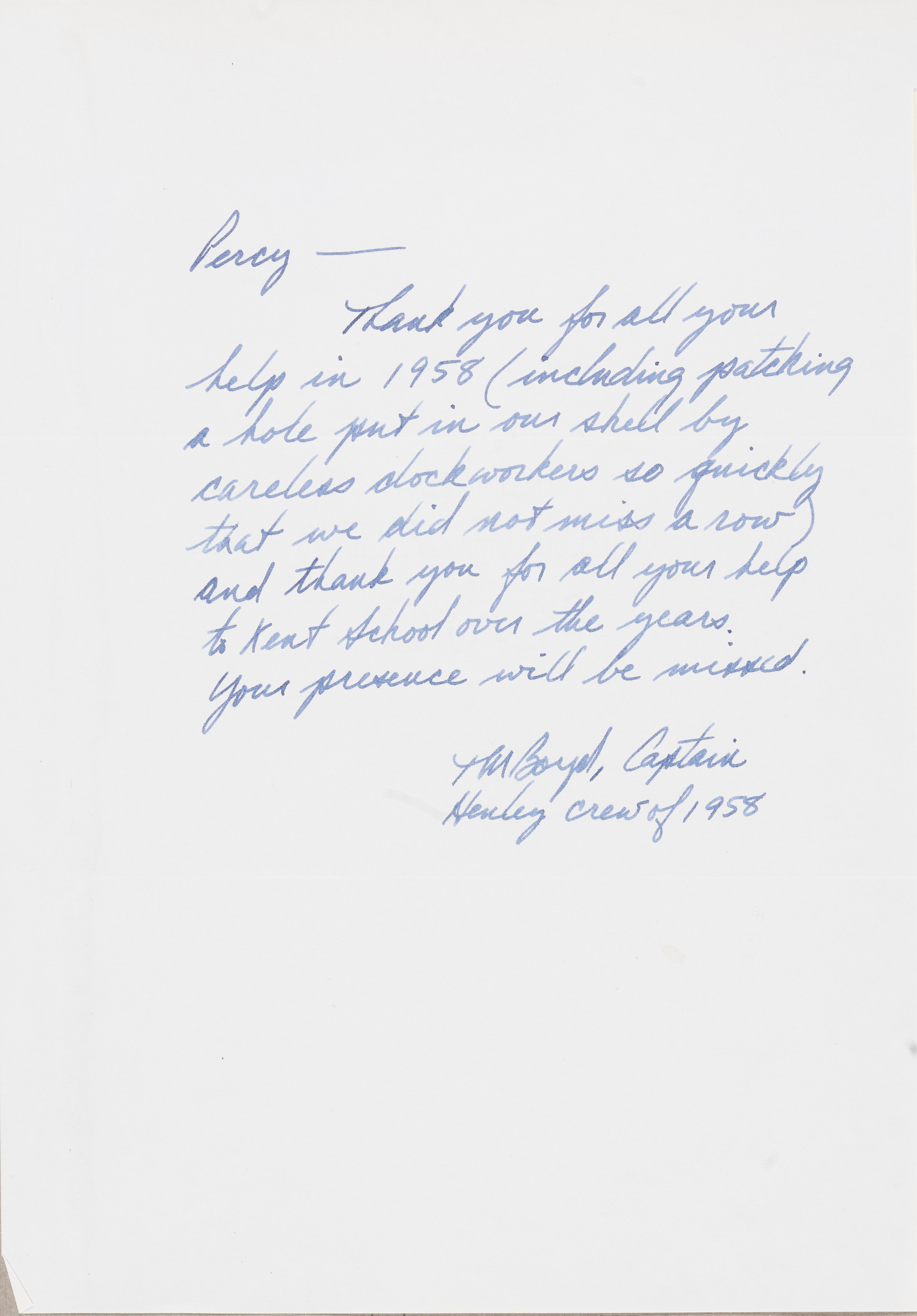 A short letter from H. Boyd, former Captain of the Henley Crew of 1958 to Percy, expressing his thanks and gratitude for his help through the years. He recalls the time Percy patched up a hole in their shell so quickly they didn't miss a row. He closes the letter telling him that he will be missed. Signed H. Boyd, Captain, Henley Crew of 1958