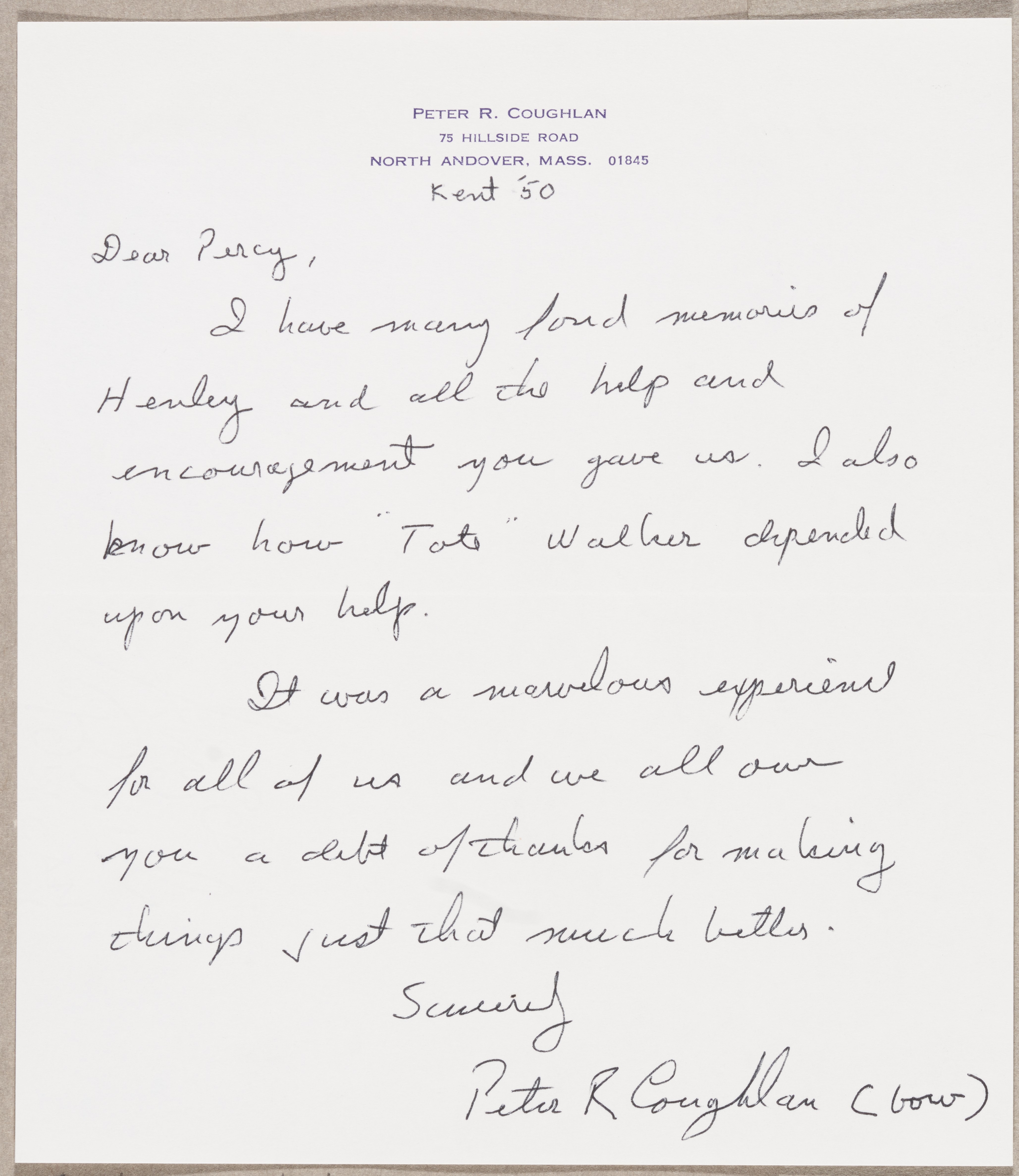 A letter from Peter R. Coughlan in North Andover, Massachusetts, to Percy, expressing his fond memories of Henley and for Percy's help and encouragement in making the experience that much better. signed Peter R Coughlan (bow).