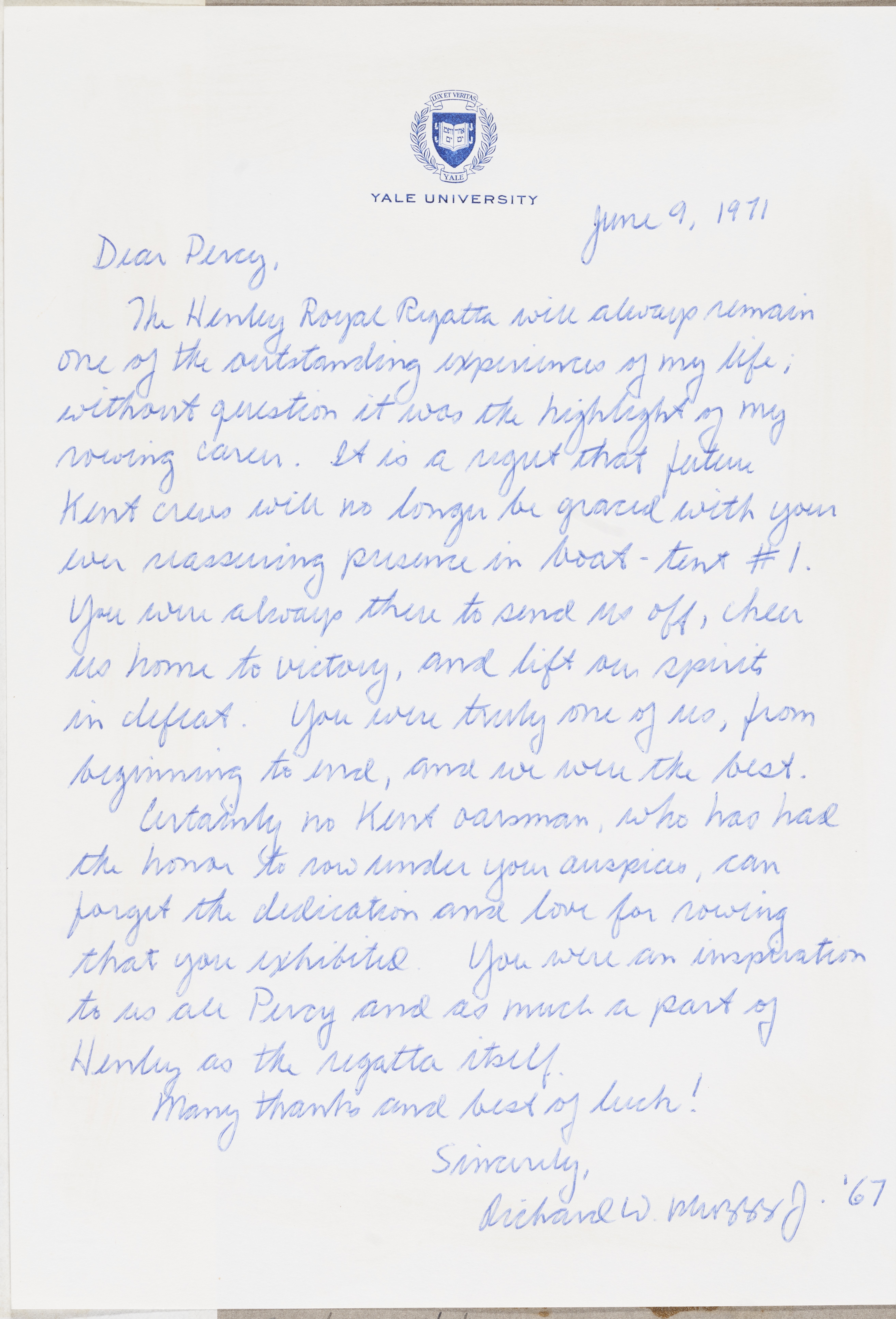 A letter from Richard Muzzy to Percy reminiscing on his experience of Henley and Percy's involvement with the crews. He thanks him for being an inspiration and wishes him the best of luck. Signed Richard Muzzy '67