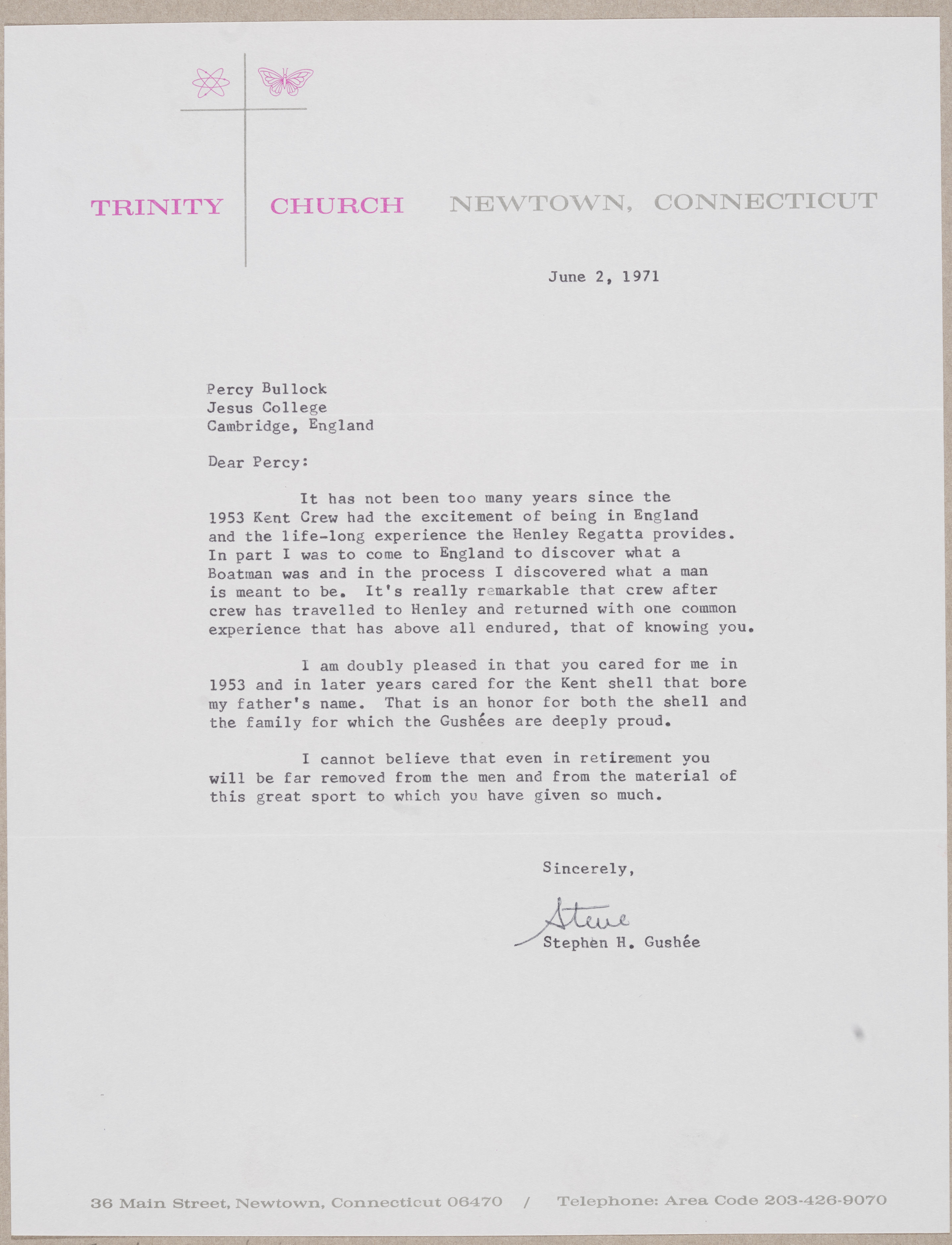 A letter from Stephen H. Gushée at Trinity Church in Newtown, Connecticut, to Percy, expressing his praise and memories of him at the Henley Regatta in 1953. He attributes all good experiences of the trip to him, and remembers him caring for the Kent shell that bore his father's name. He closes the letter acknowledging that although retiring he won't imagine him to be far removed from the sport.
