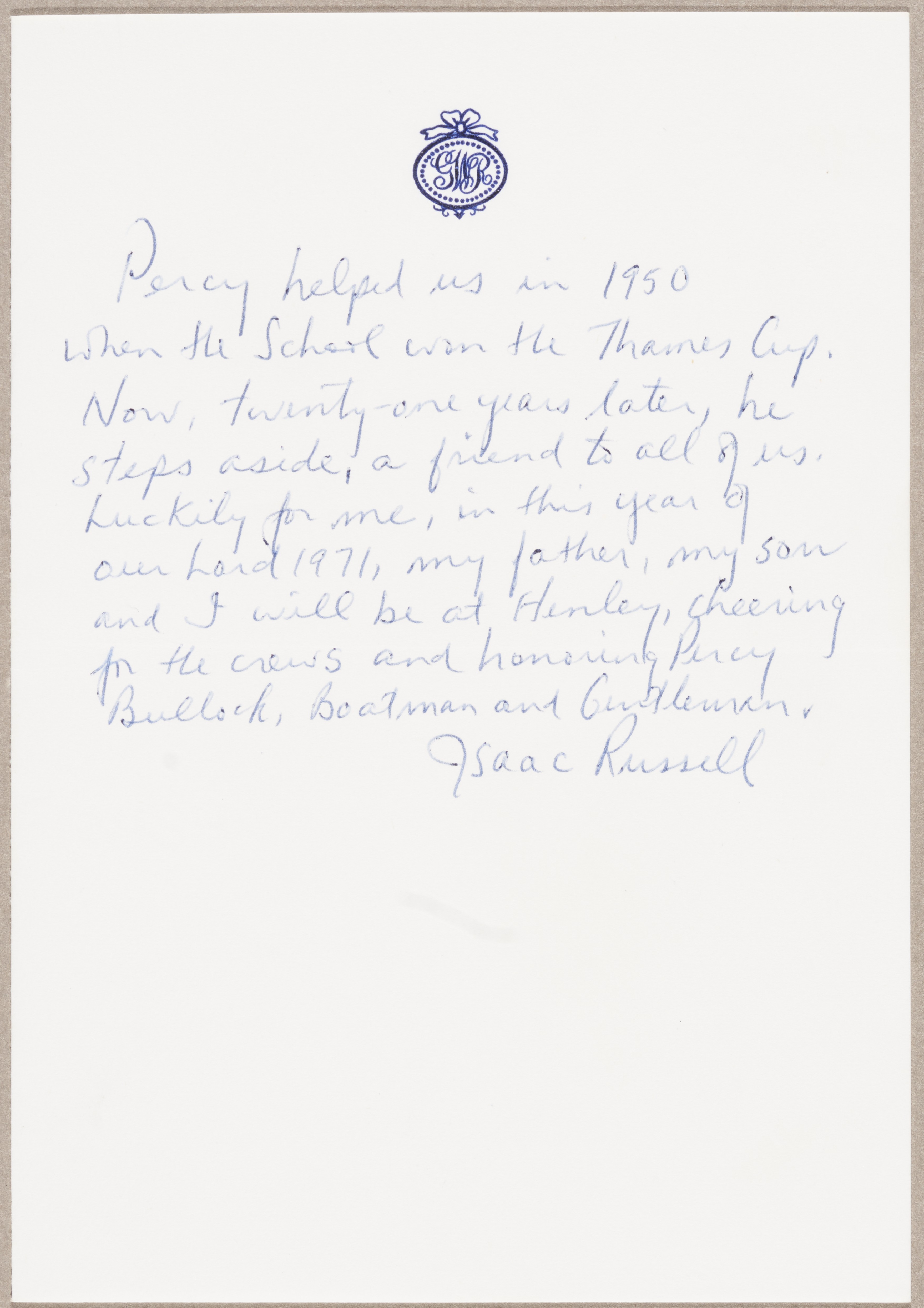 Percy helped us in 1950 when the School won the Thames Cup. Now, twenty-one years later, he steps aside, a friend to all of us. Luckily for me, in this year of our Lord 1971, my father, my son and I will be at Henley, cheering for the crews and honouring Percy Bullock, Boatman and Gentleman.