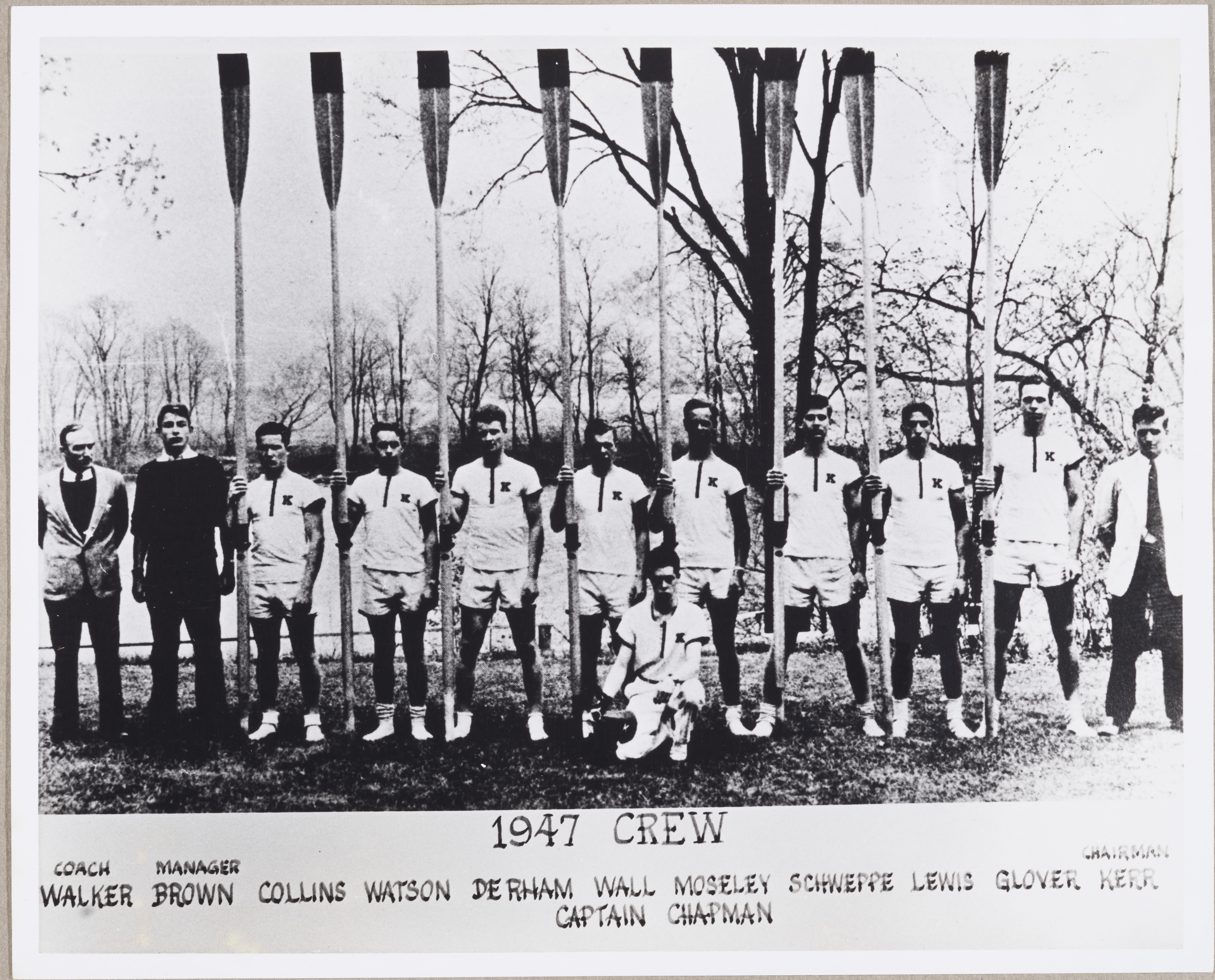 A copy of a black and white photograph titled '1947 Crew' depicting the crew posing with oars. Also includes the coach, manager, and chairman.