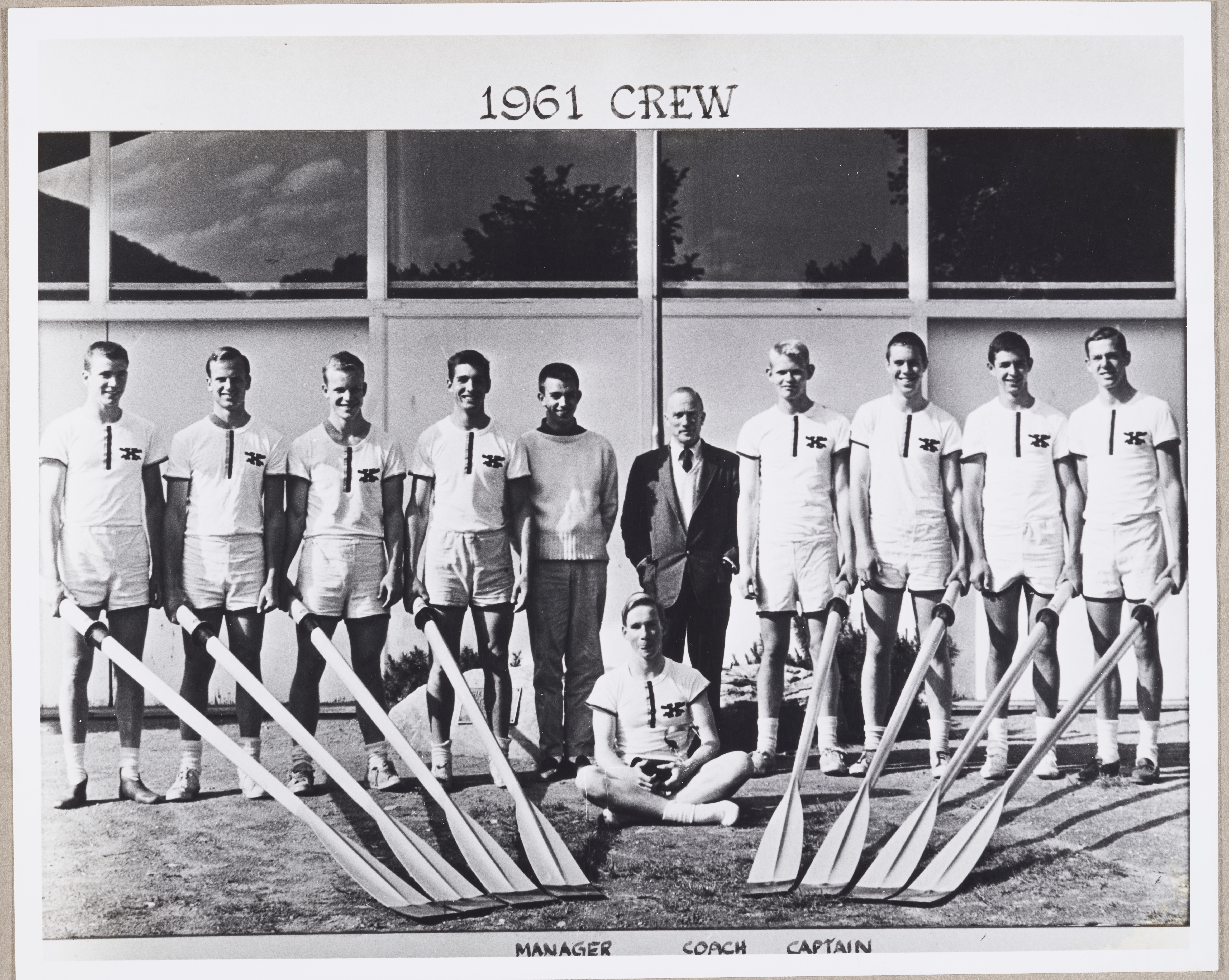 A copy of a black and white photograph of the 1961 crew for the Kent School, Connecticut, posing in front of a boathouse with their oars. The manager and coach are also in the picture.