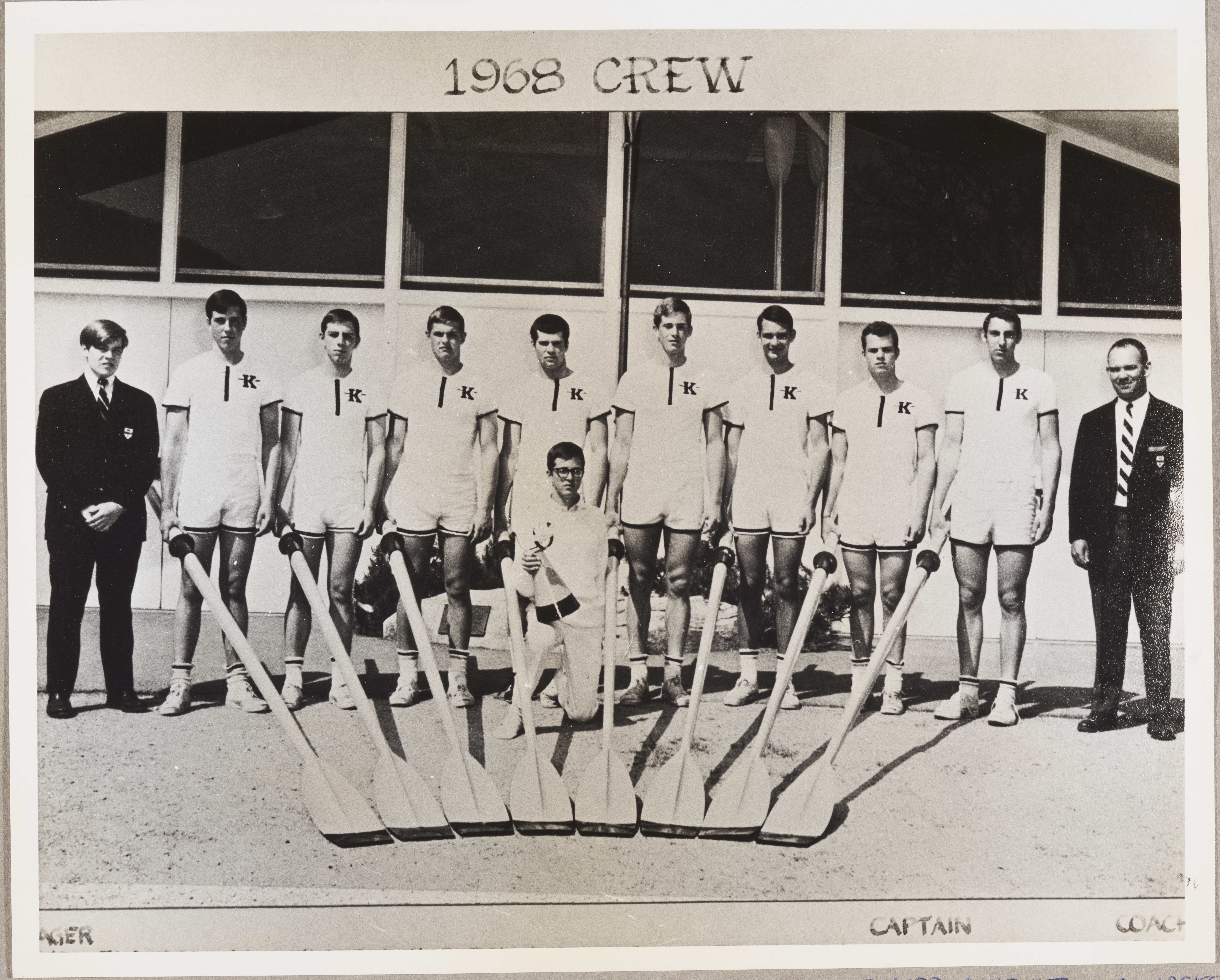 A copy of a black and white photograph depicting the 1968 Crew posing in front of a boathouse with their oars. Also includes the manager and coach in the picture.
