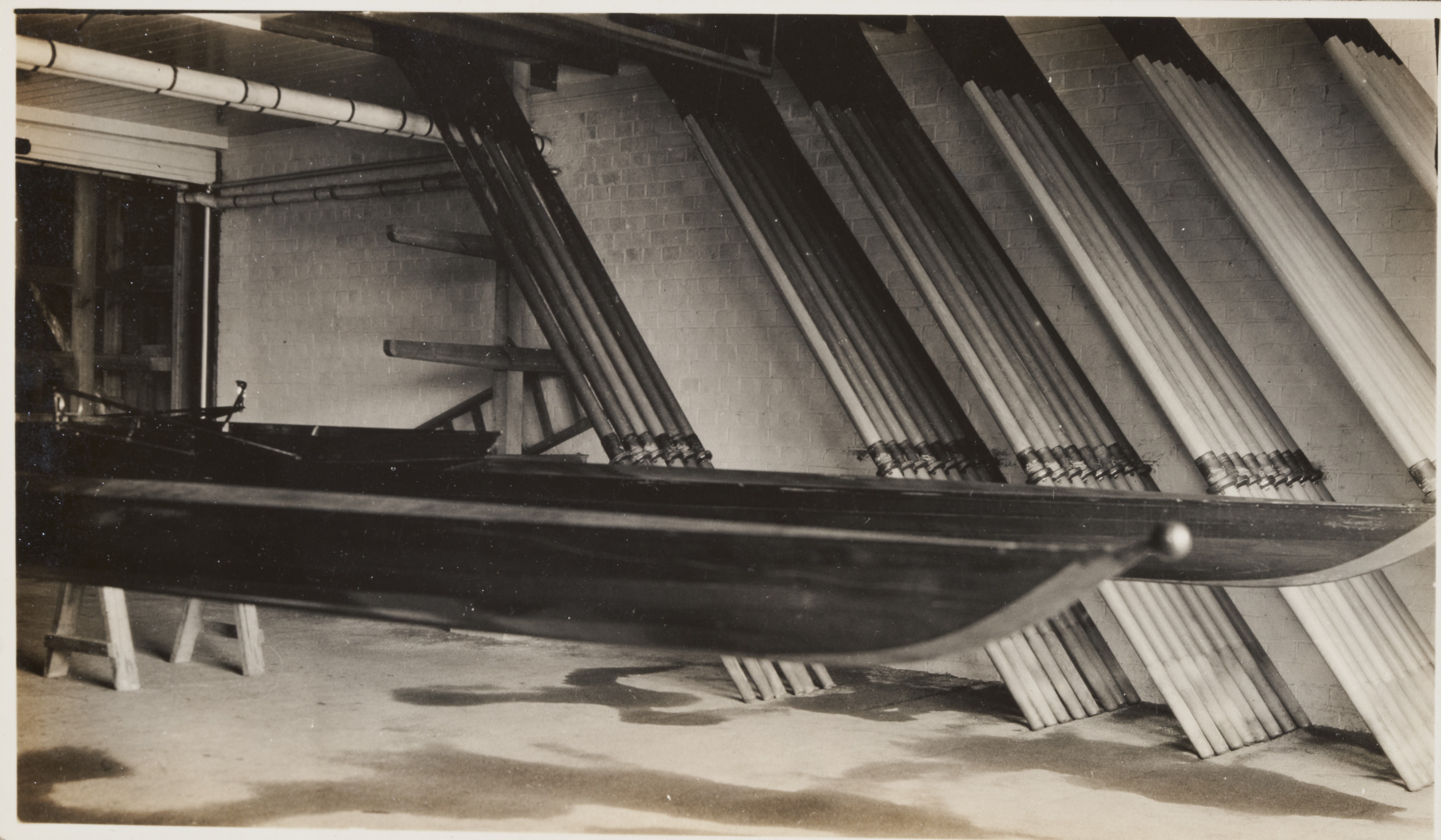 A black and white photograph of a boat inside the boathouse next to a stack of oars.