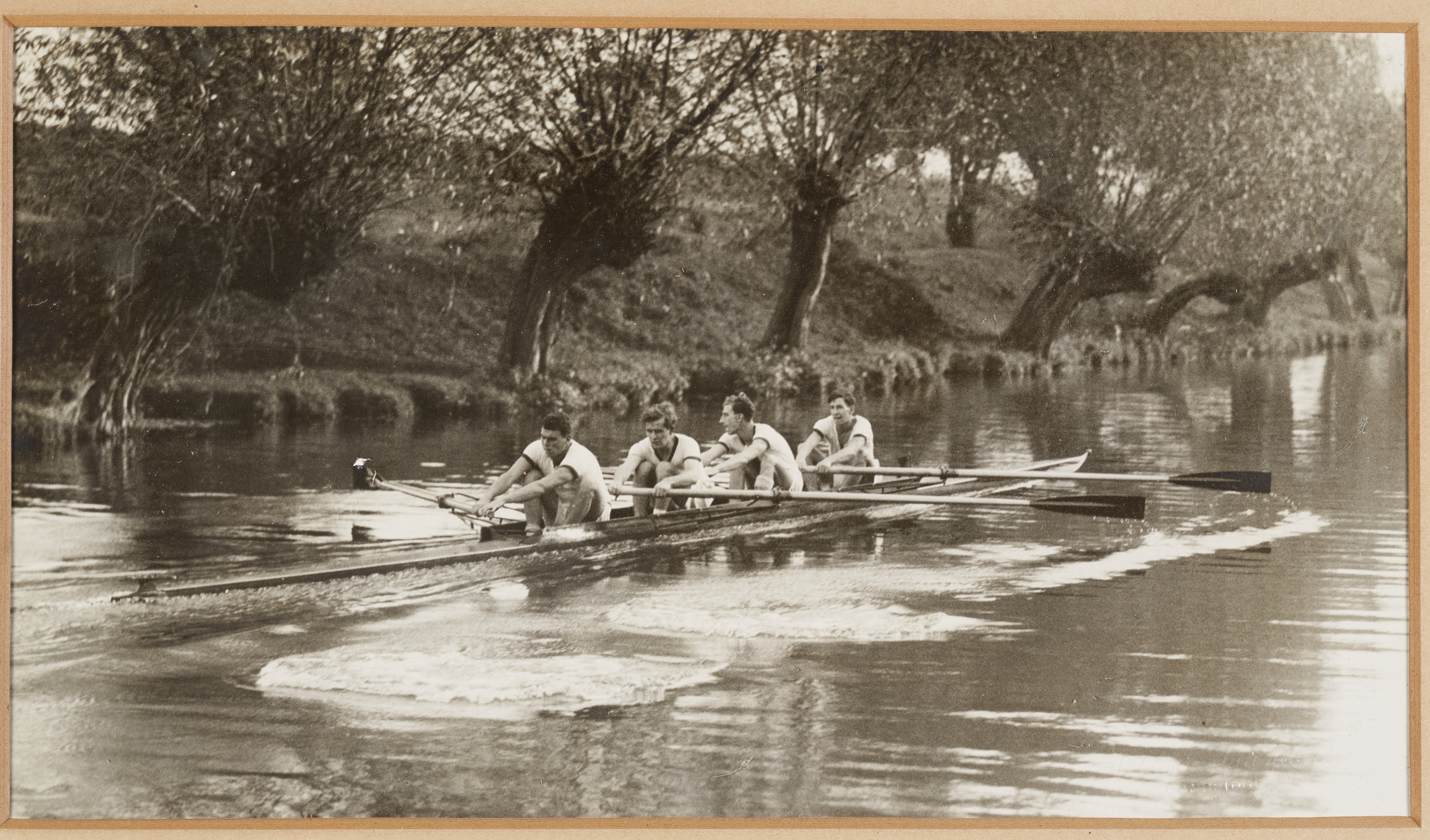 A black and white photograph of a boat of four rowers on the river taken by Hills and Saunders photographers, Cambridge.