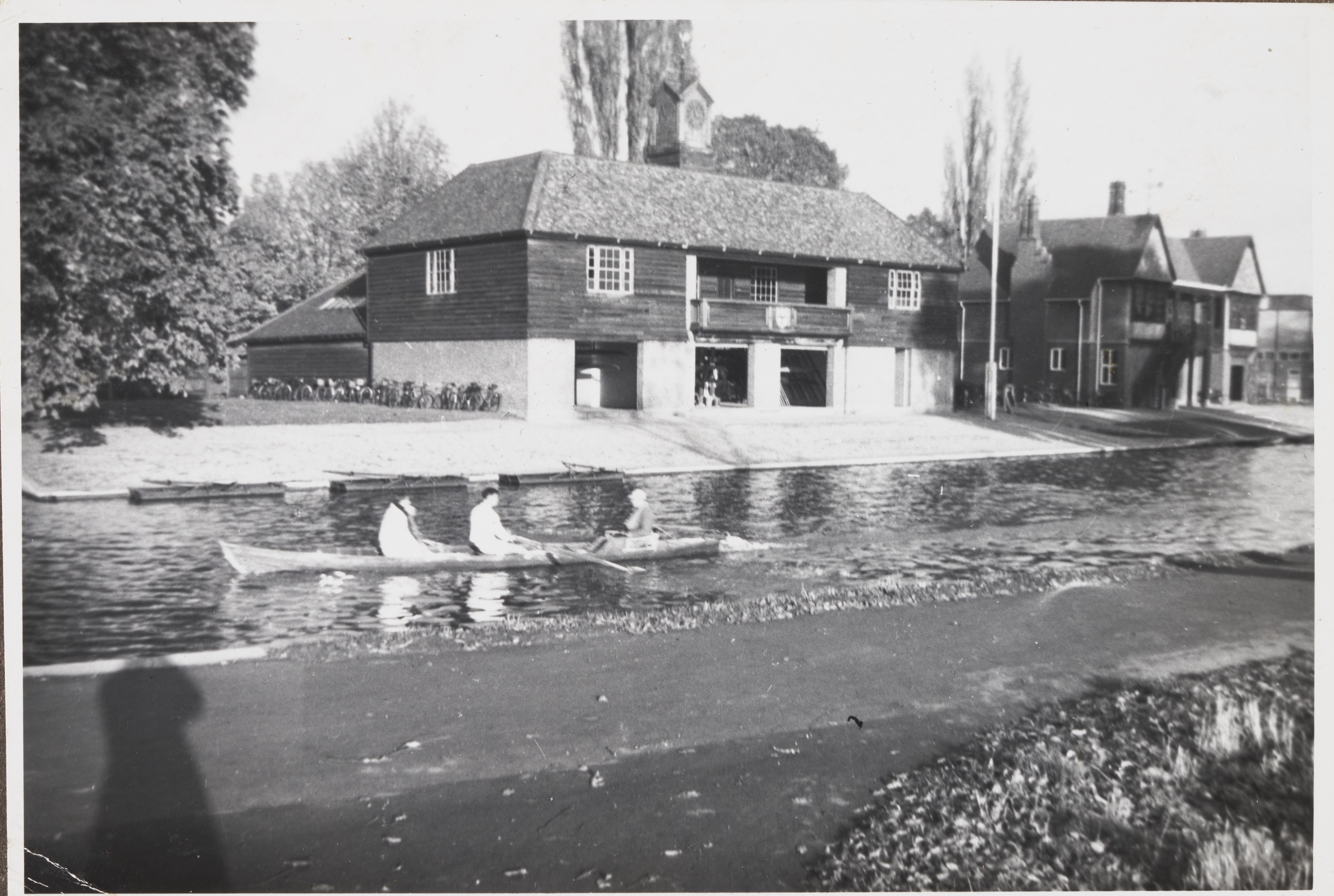 A black and white photograph of a pair in a boat on the river outside of the Jesus College Boathouse.