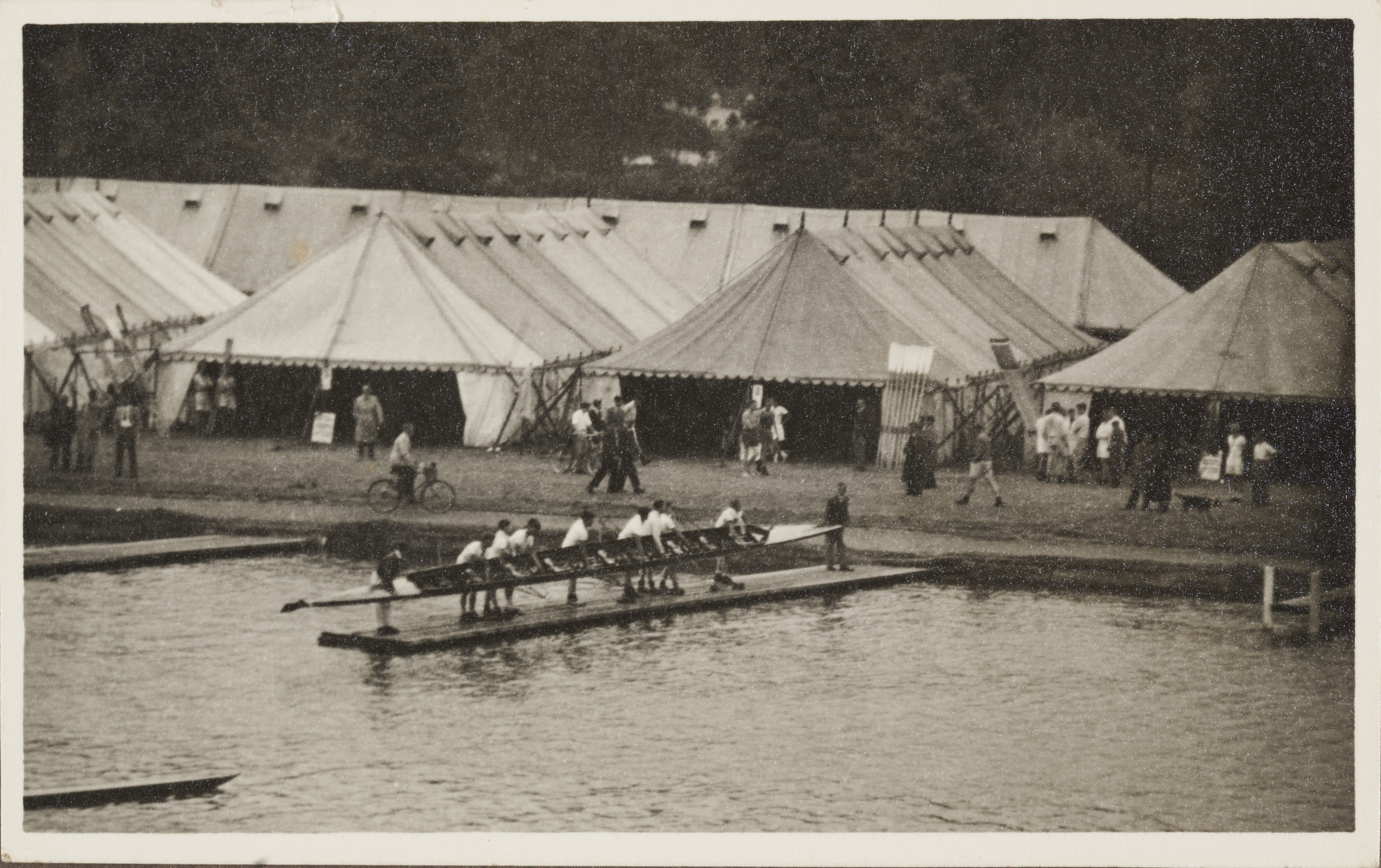 A black and white photograph of a crew carrying a boat outside the tents at Henley Regatta.
