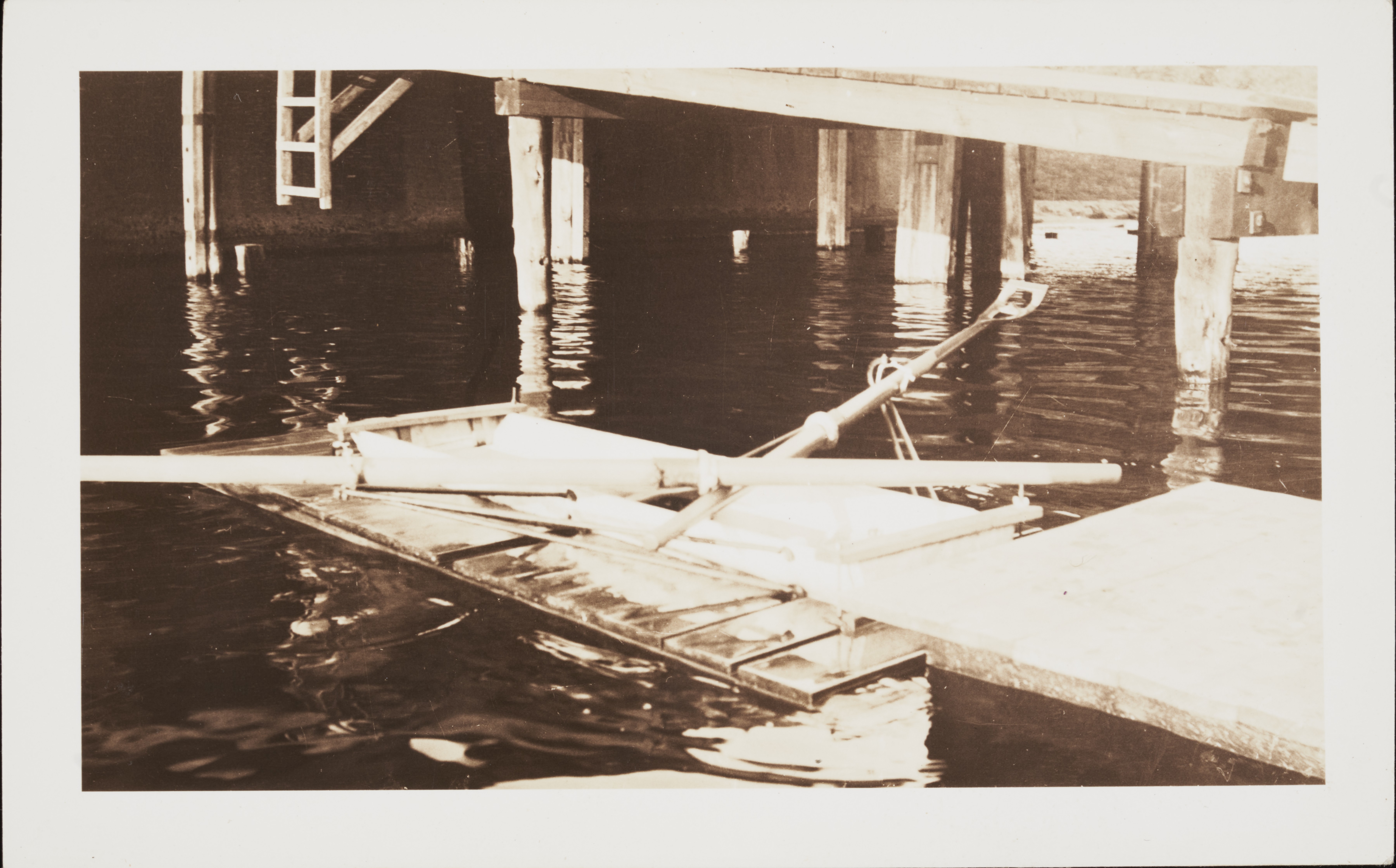 The sculling tub. A long wharf is built out into the water from the boathouse, and this is attached to the wharf, pointed in towards the shore. The sculls are cut away in the centre rather too much, I think.