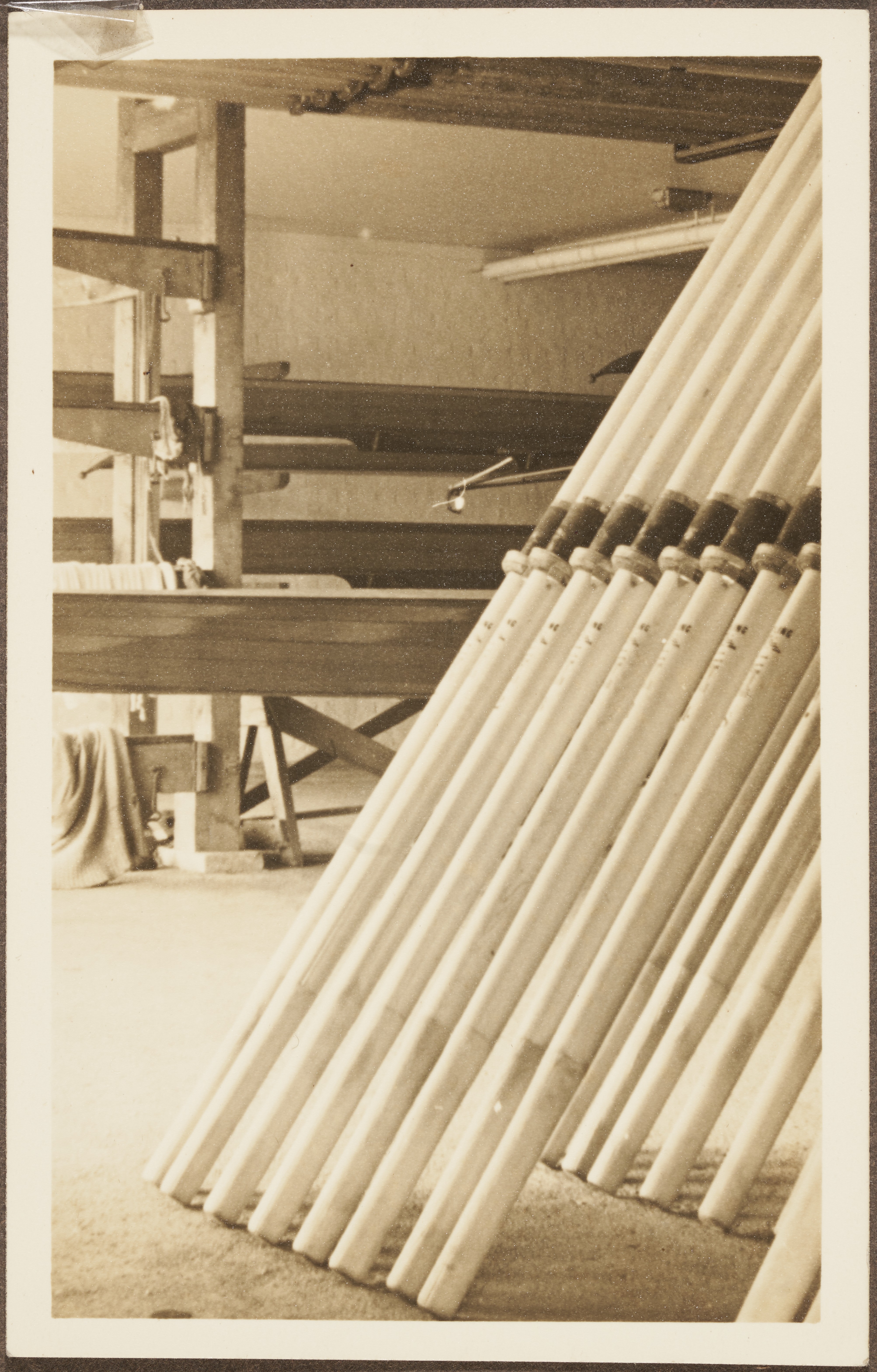 A black and white photograph of a stack of oars inside a boathouse.