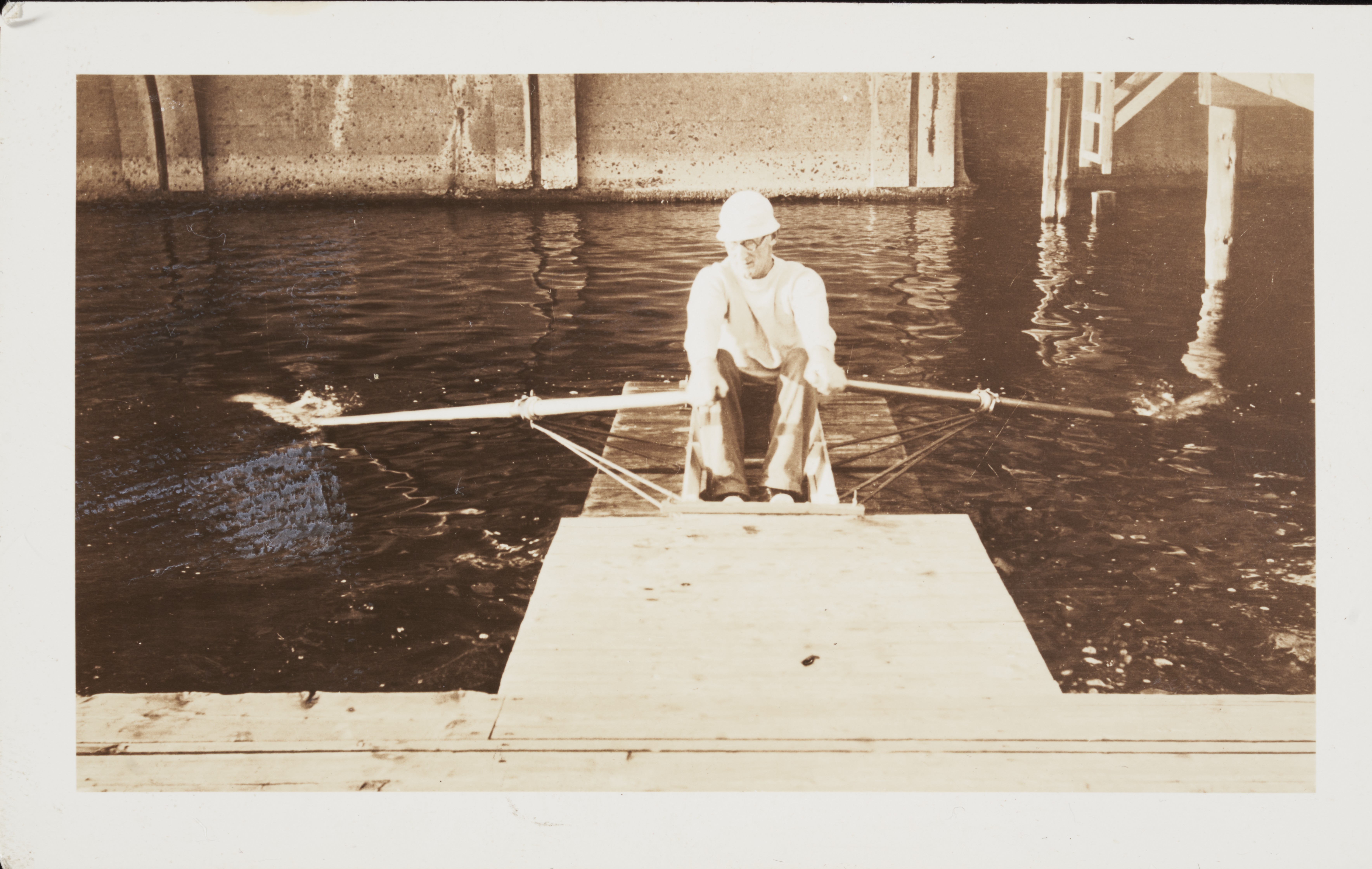 A sepia photograph of Blake, the boatman for The Weld boathouse, sitting in a sculling tub. The picture is taken on the Charles river in Cambridge, Massachusetts.