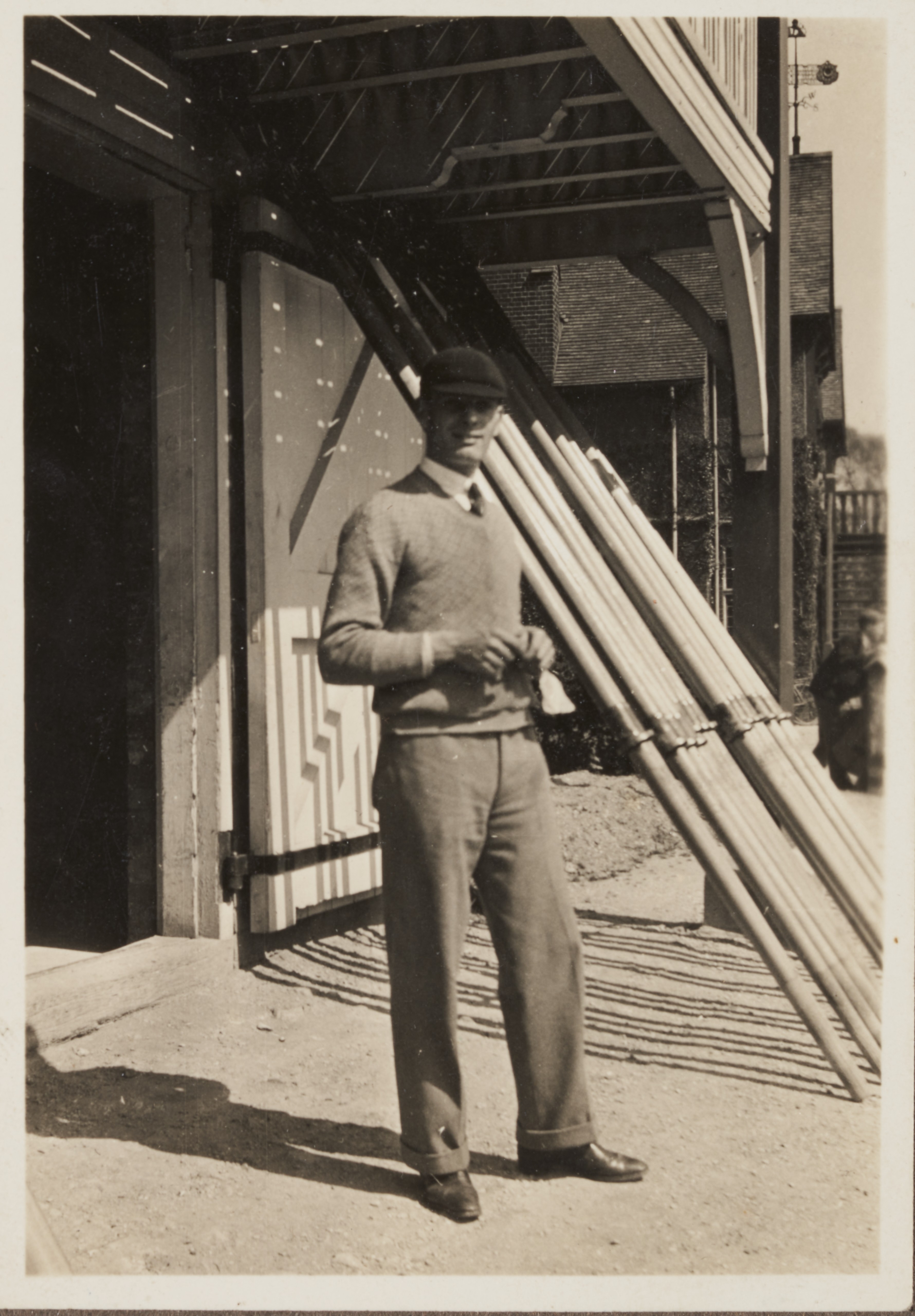 A sepia photograph of Percy standing outside the Jesus College Boathouse.