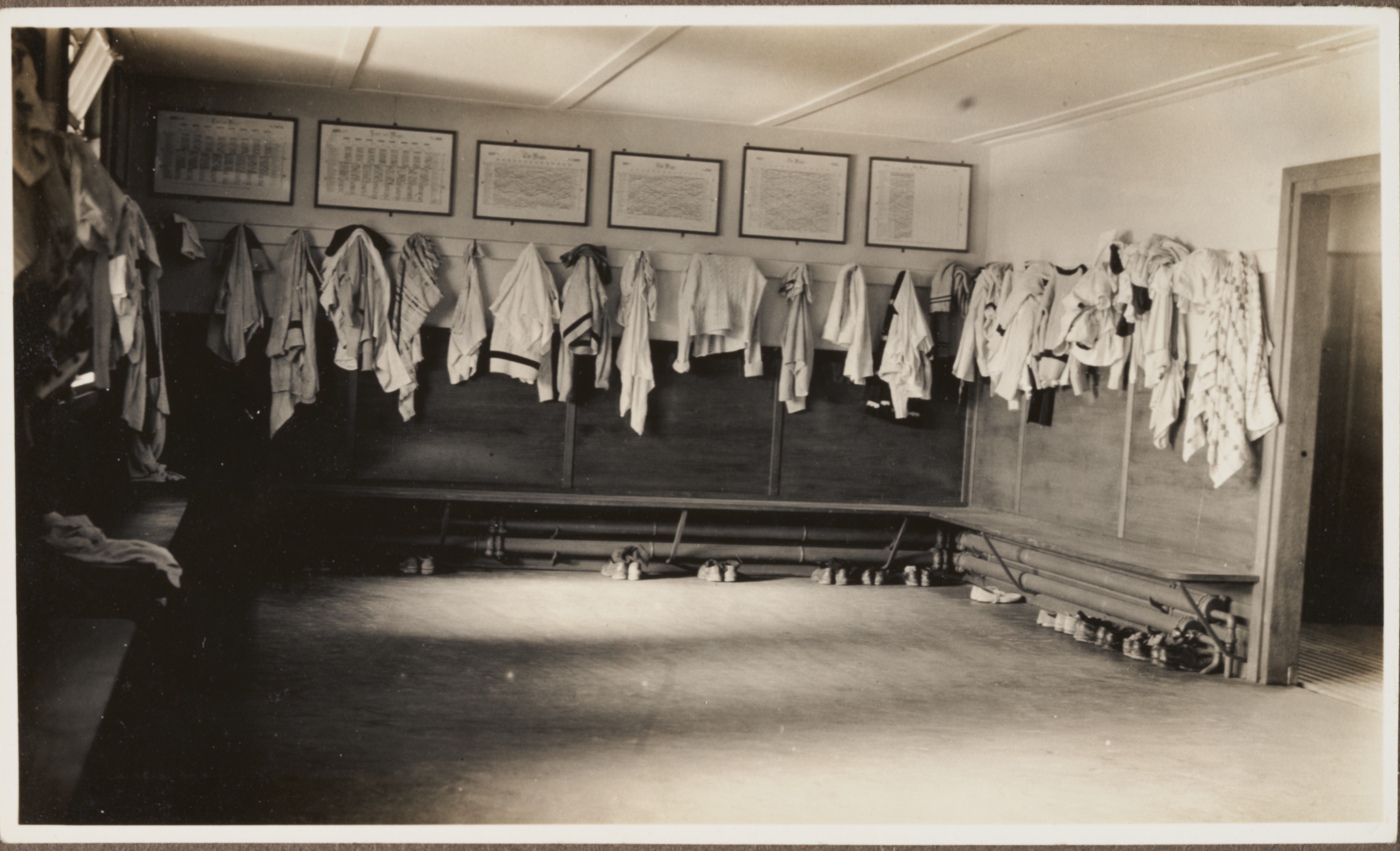 A black and white photograph of the Jesus College Boathouse changing room with clothes hanging up on pegs.