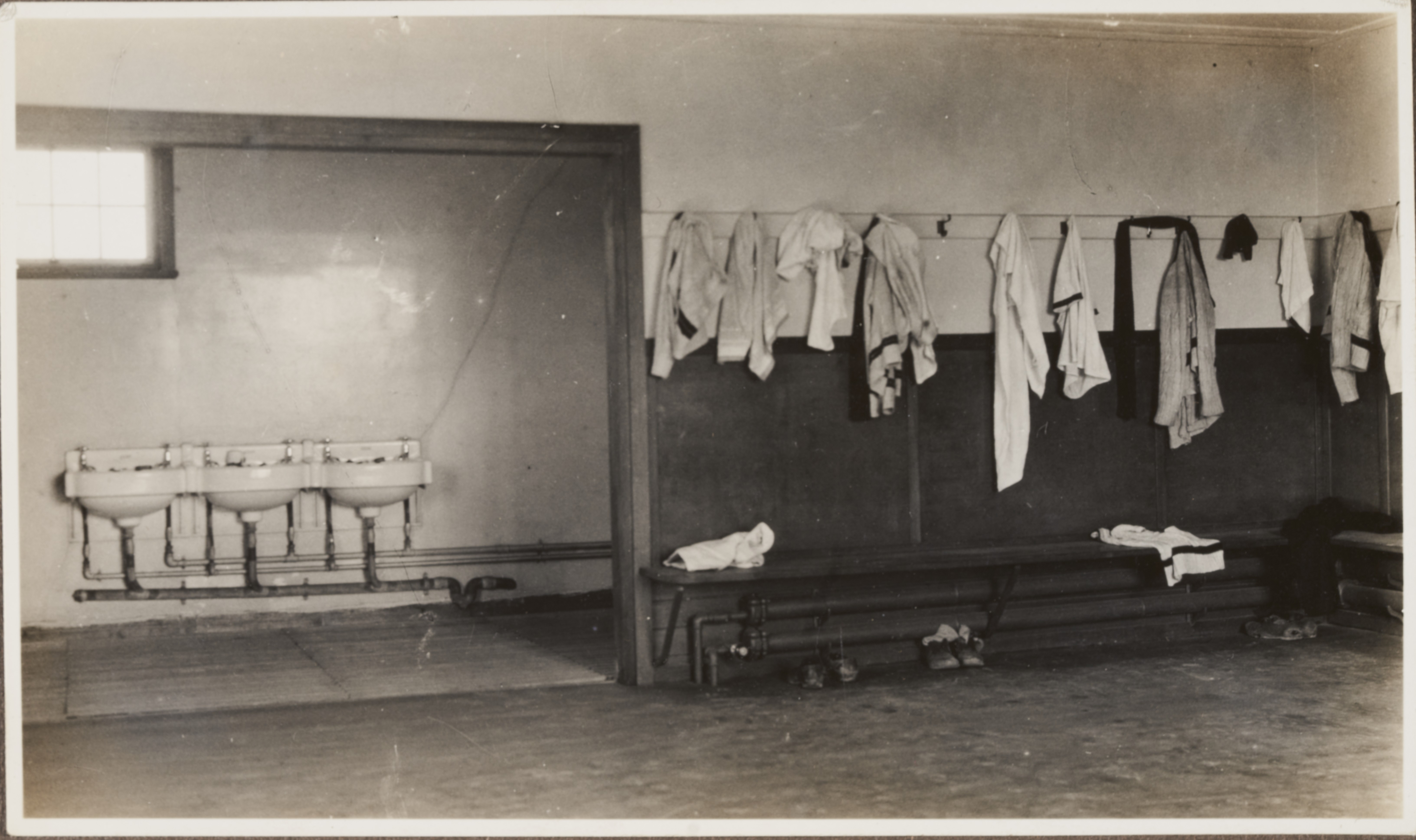 A black and white photograph of the Jesus College Boathouse changing room showing a row of pegs with clothes on and sinks in the background.