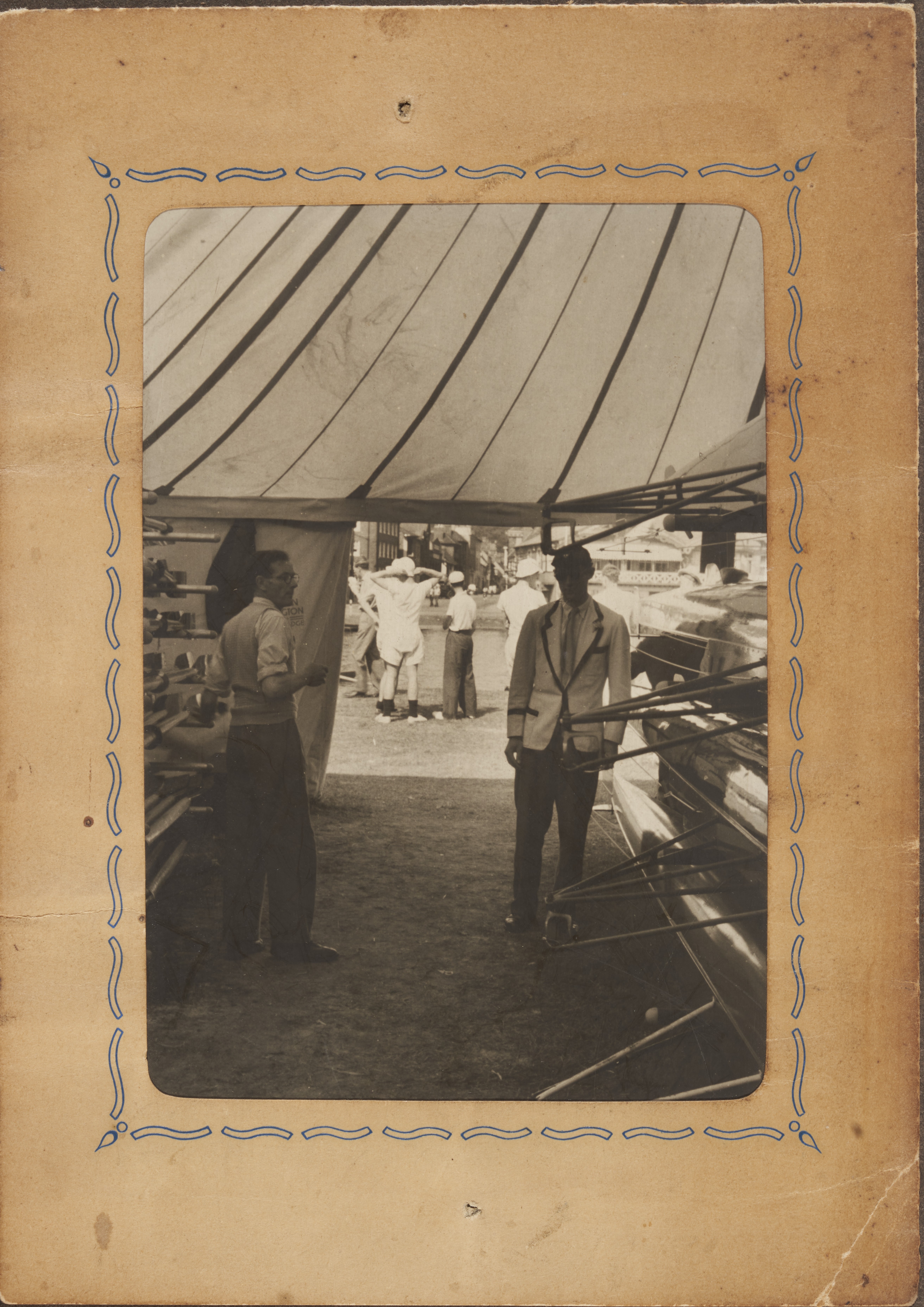 A mounted black and white photograph of two crew members, one in a Boat Club blazer, standing inside a boat tent. Possibly taken at Henley.