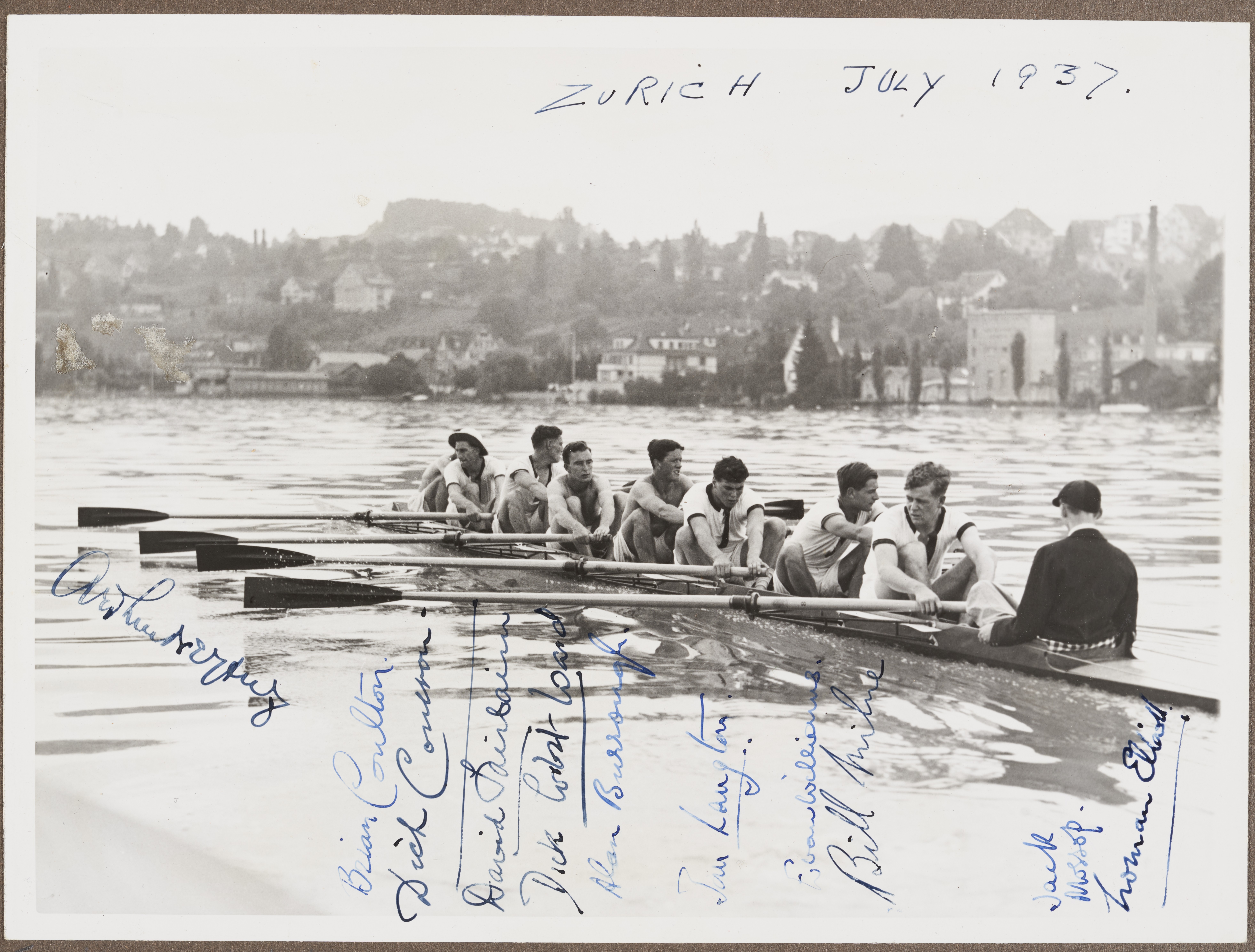 A black and white photograph of the first eight crew on the river in Zurich. The picture is annotated in blue ink including a title that reads 'Zurich July 1937'. Each crew member has signed their name against their picture including: