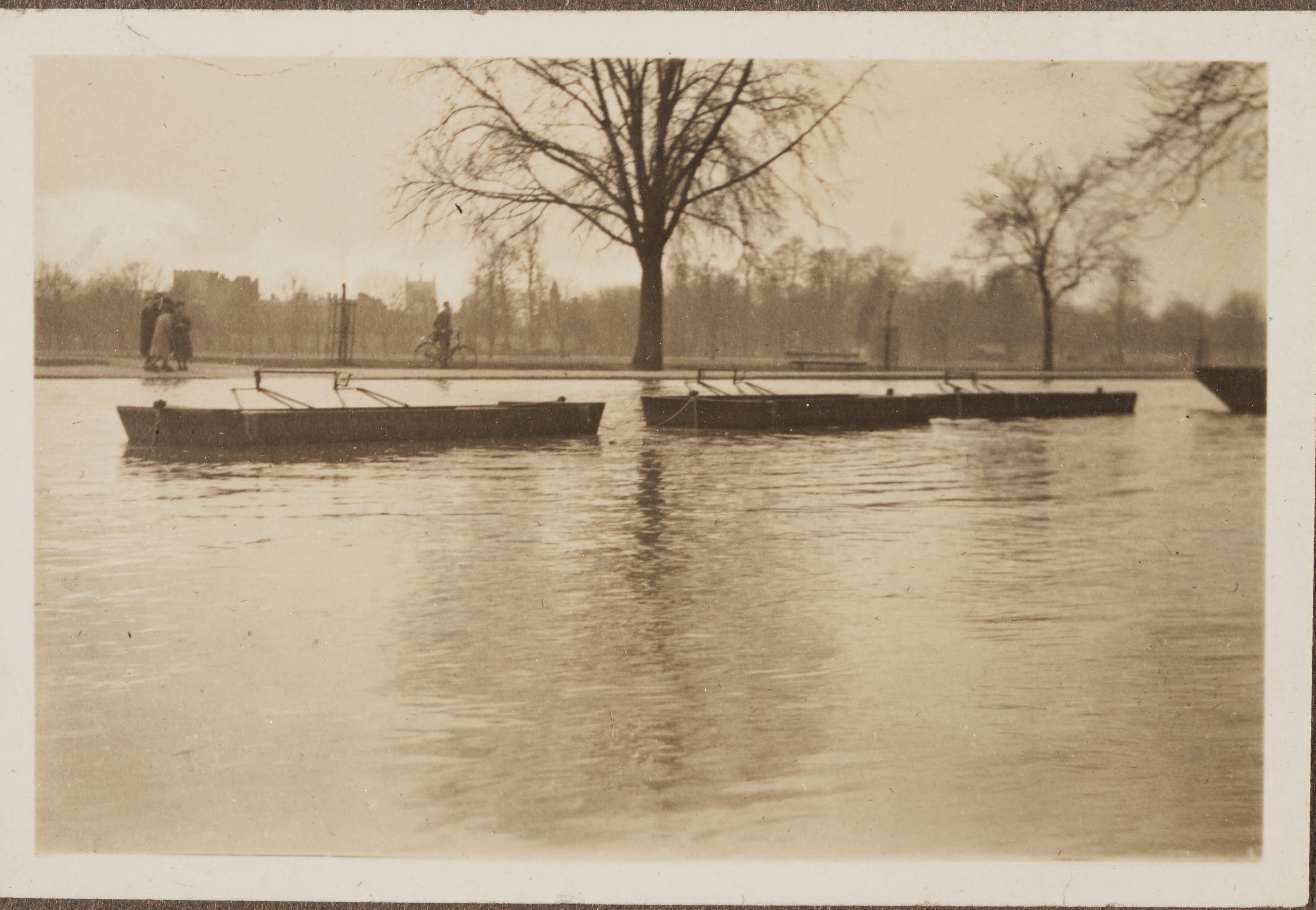 A small sepia photograph taken at a distance of 3 empty boats in the water with people standing on the side.