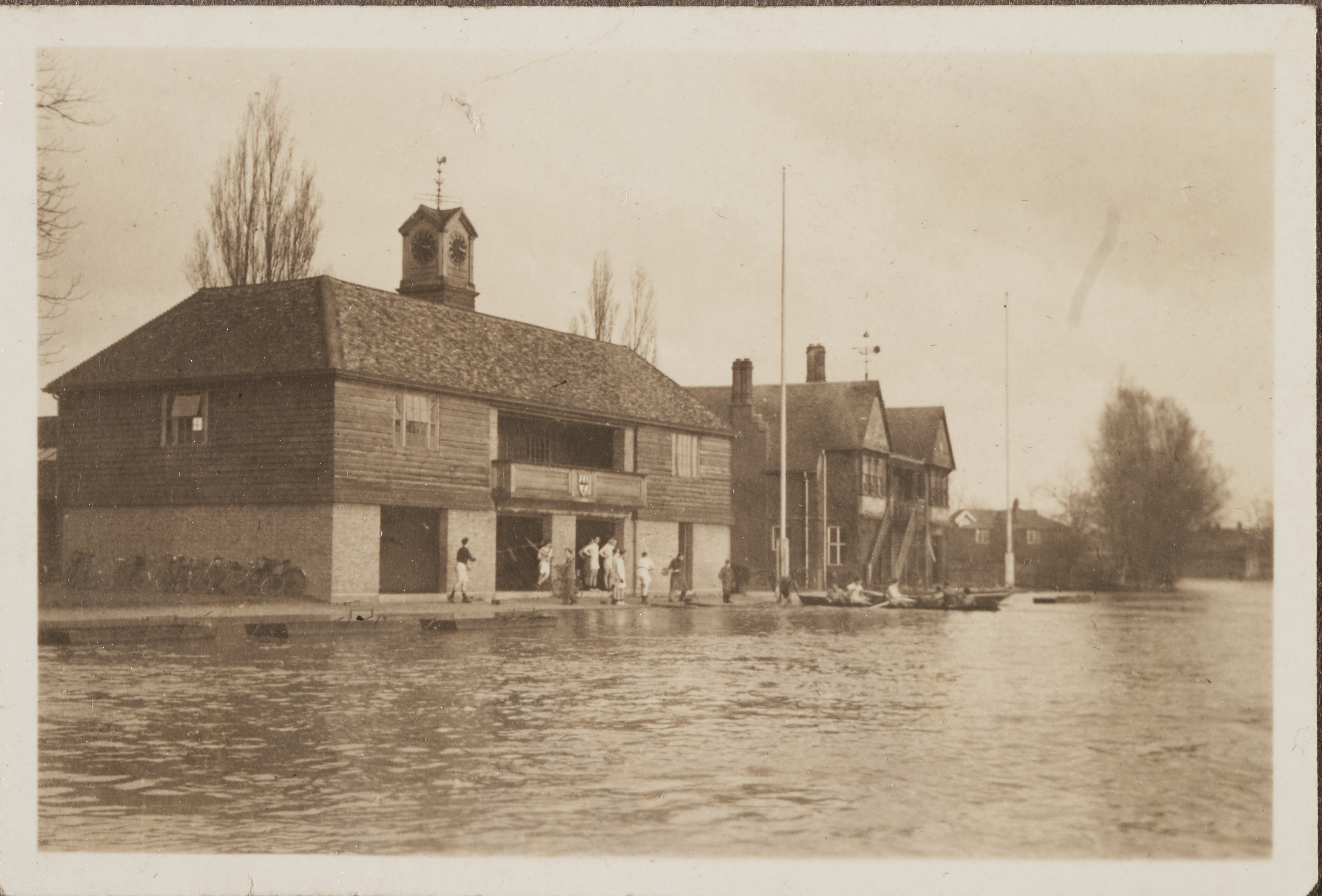 A small sepia photograph of Jesus College Boathouse taken from a distance, with people standing on the waterfront.